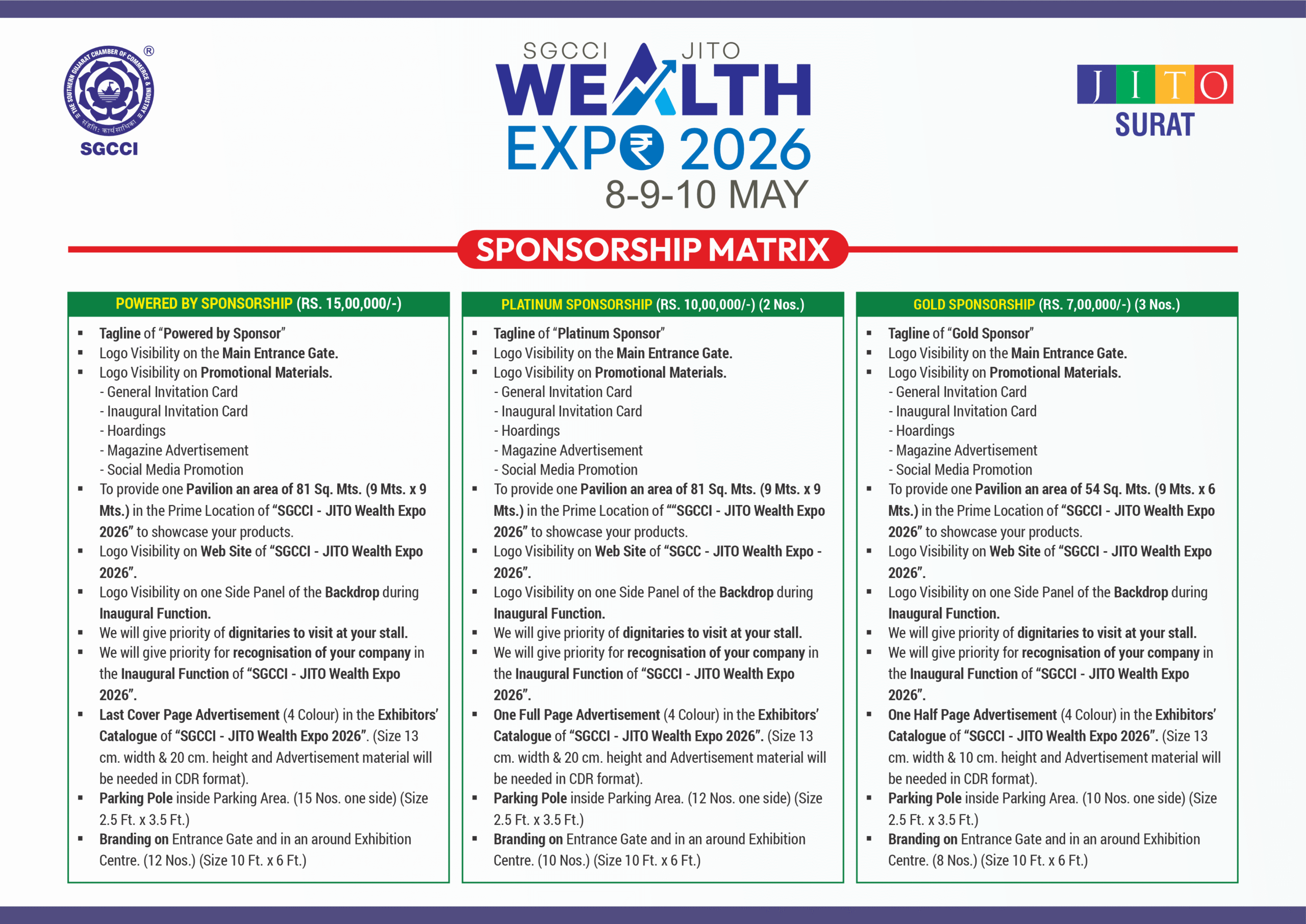 The Southern Gujarat Chamber of Commerce & Industry (SGCCI) was established in the year 1940, the oldest apex body of Gujarat has a strong base of more than 13,500+ direct members and 150+ associations from a wide spectrum of Trade & Industry. An ISO 9001:2015 certified SGCCI is dedicatedly serving to the Trade & Industry since 85 years. SGCCI has mastered the Art of Exhibitions and Trade Fairs mainly organizing Industry Specific Exhibitions...